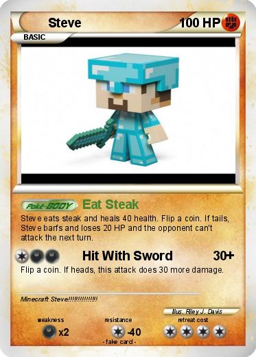 Steve eats steak and heals 40 health. Flip a coin. If tails, Steve barfs and loses 20 HP and the opponent can't attack the next turn.