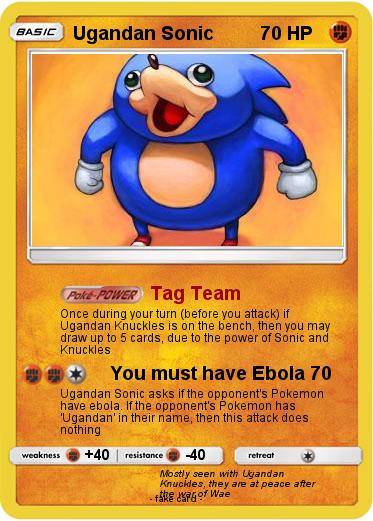 Ugandan Sonic asks if the opponent's Pokemon have ebola. If the opponent's Pokemon has 'Ugandan' in their name, then this attack does nothing